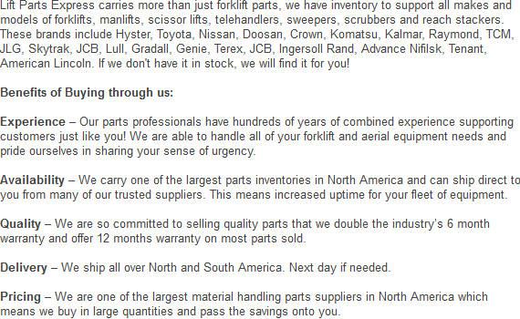 For your entire fleet of lift trucks, we offer the best prices on all our parts. Give us a call now if you are interested in receiving a price estimate on our attachments or parts. Our number is: